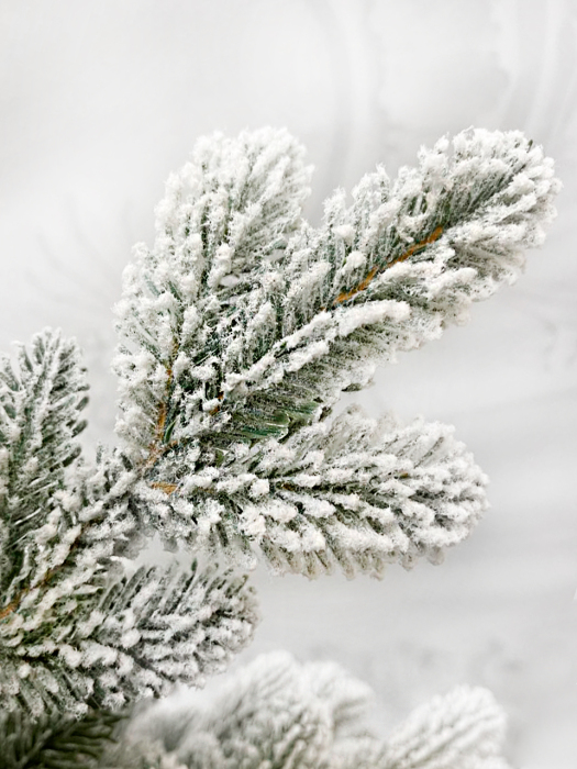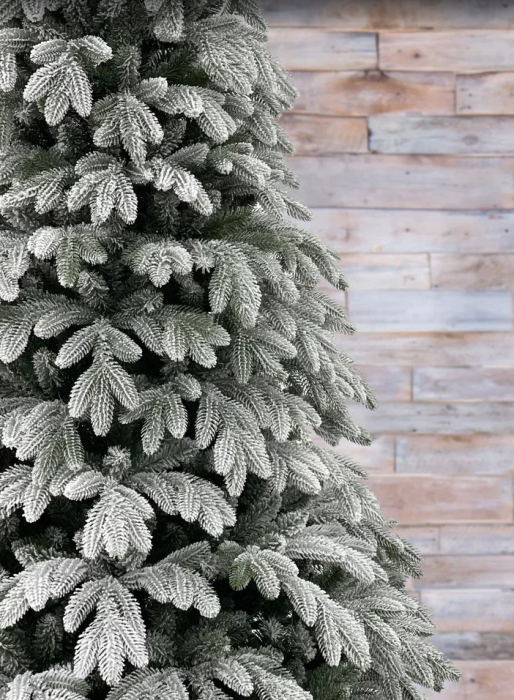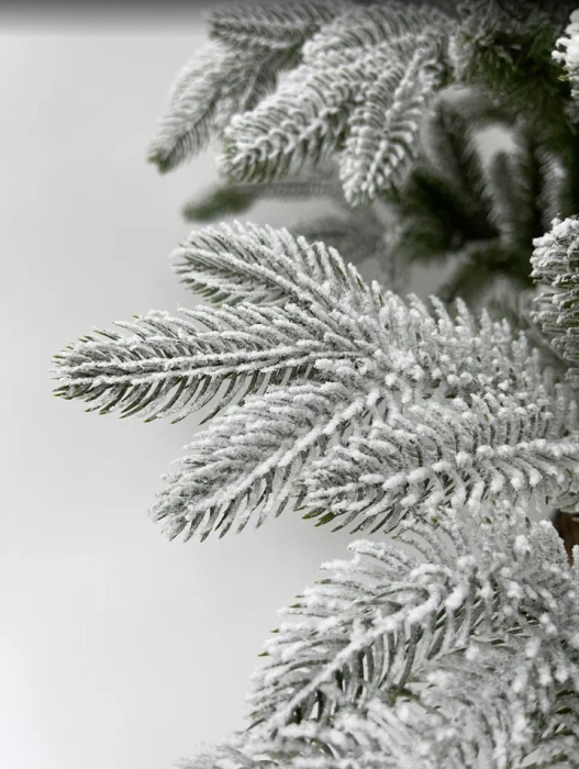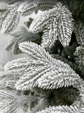 Эта искусственная ель выполнена в максимально реалистичном стиле с эффектом густого снежного покрытия. Ветви плотные и равномерно распределены по всей высоте, формируя аккуратную коническую форму. Хвоя выглядит натурально: крупные пушистые иголки с мягким снежным напылением создают ощущение свежего зимнего леса.