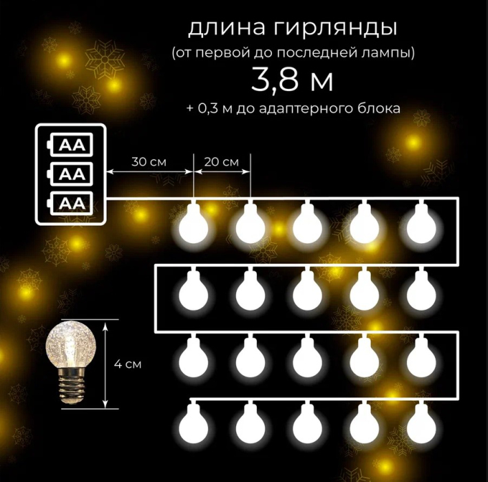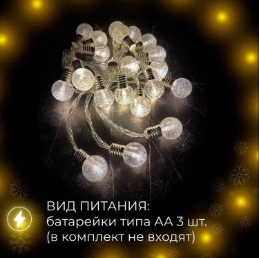 Гирлянда LED Гладкие шарики на батарейках, теплый белый свет, 20 ламп, 8 функций