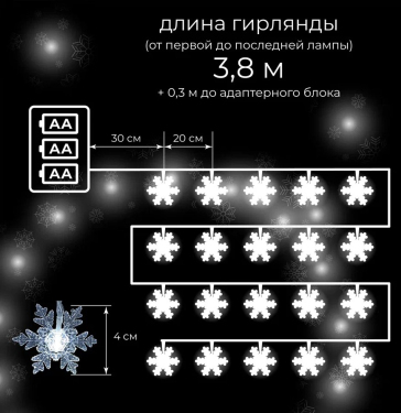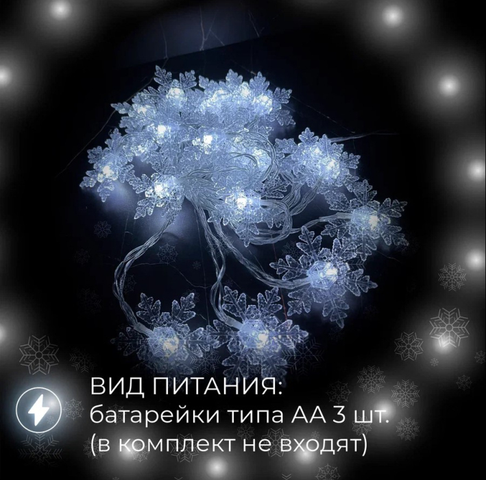 Гирлянда LED Снежинки на батарейках, холодный свет, 20 ламп, 8 функций