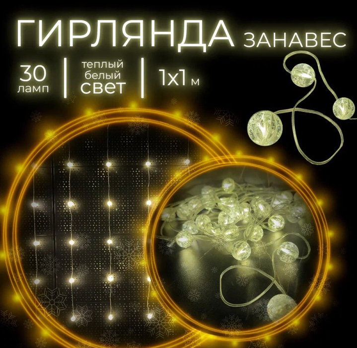 Гирлянда-занавес LED Шар, теплый белый свет, 30 ламп, 8 функций, 100х100 см