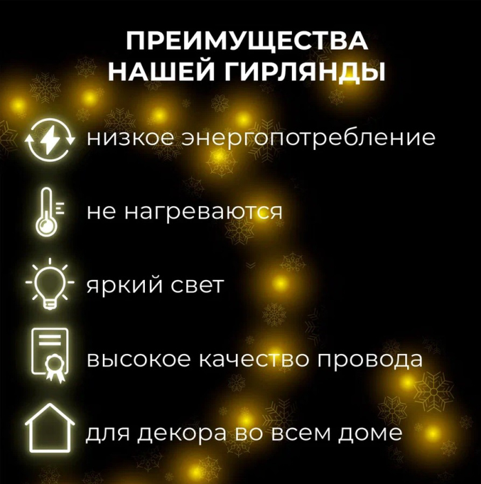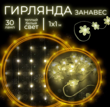 Гирлянда-занавес LED Снежинка, теплый белый свет, 30 ламп, 8 функций, 100х100 см